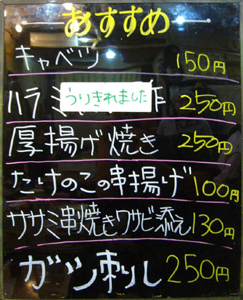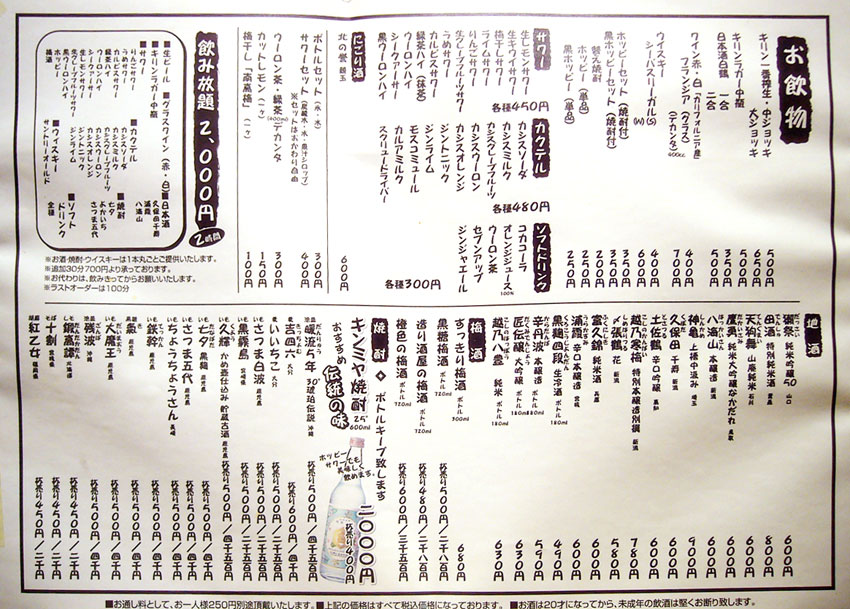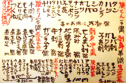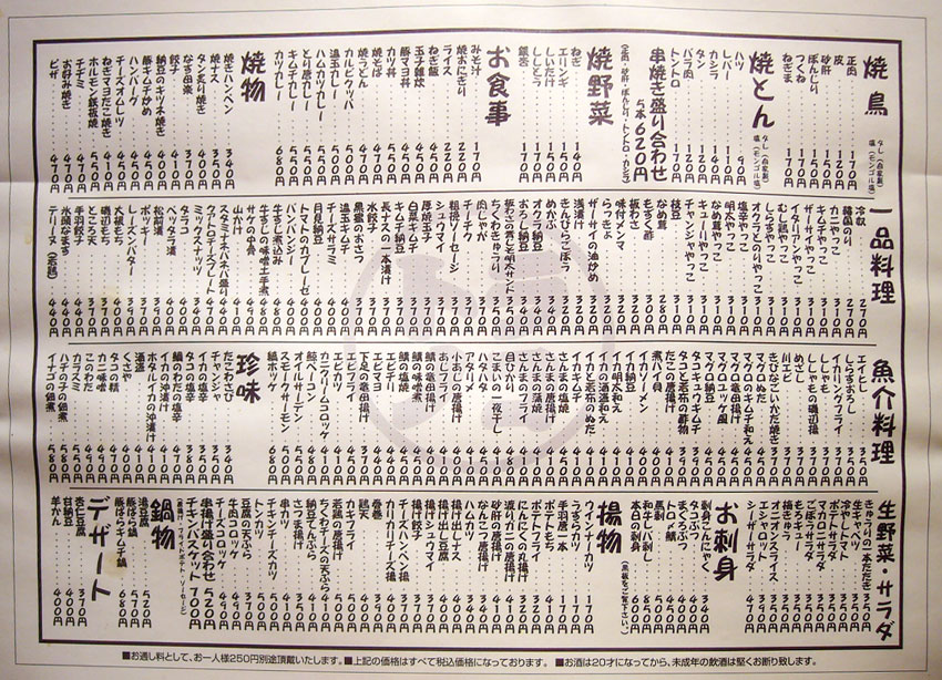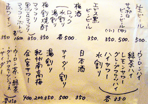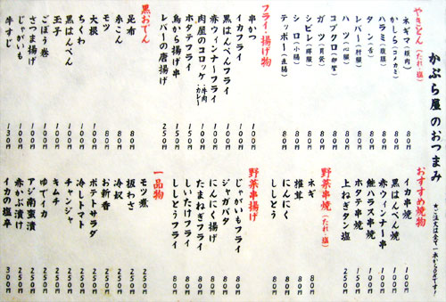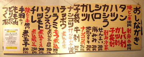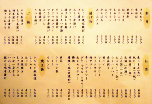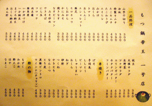 店に入るとまず何人前か聞かれるほど、ここでモツ鍋はデフォルトなので、メニューには見当たらなかったです。ちなみに1人前が締めのラーメン込みで1,500円。追加の具は、モツ800円、ニラ400円、キャベツ400円、麺300円だそうで。で、鍋以外のメニューも相当充実してるんですが、実はこれがそんなに大した事ない上に鍋一通りだけでかなりボリュームあるので、基本的には鍋と酒しか頼みません。でもメニューブログなのでどうぞ↓。